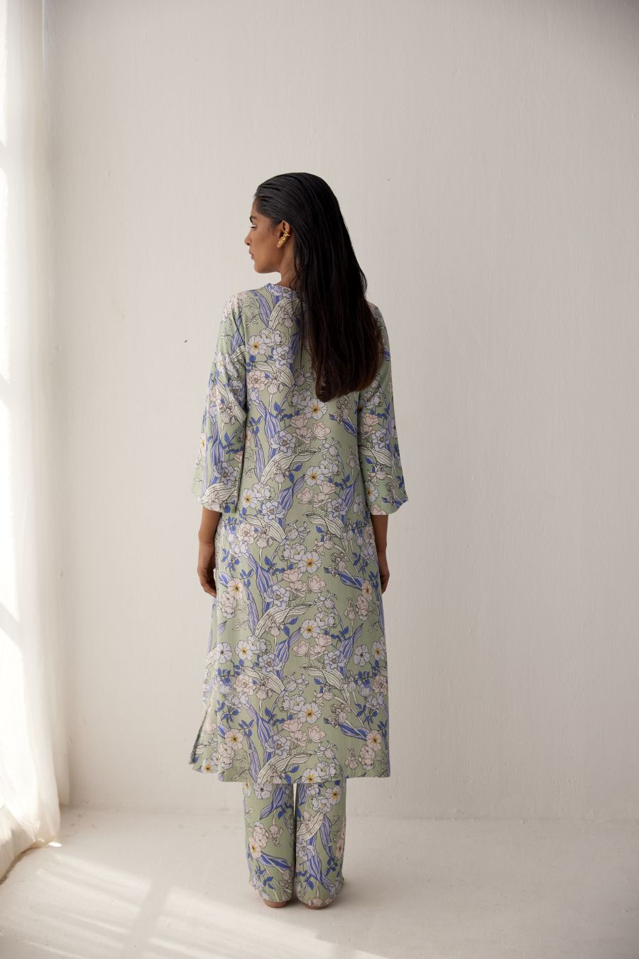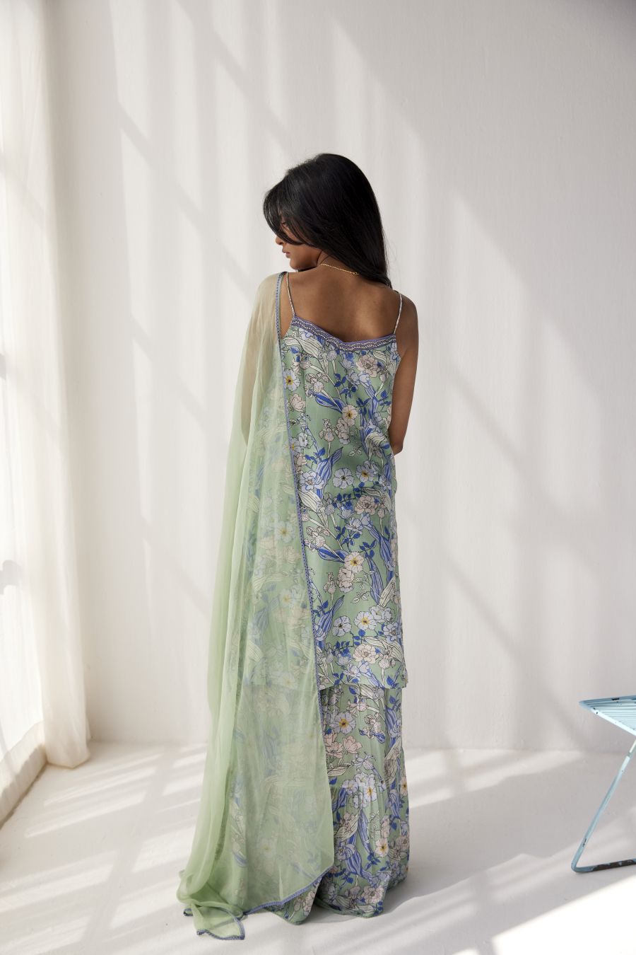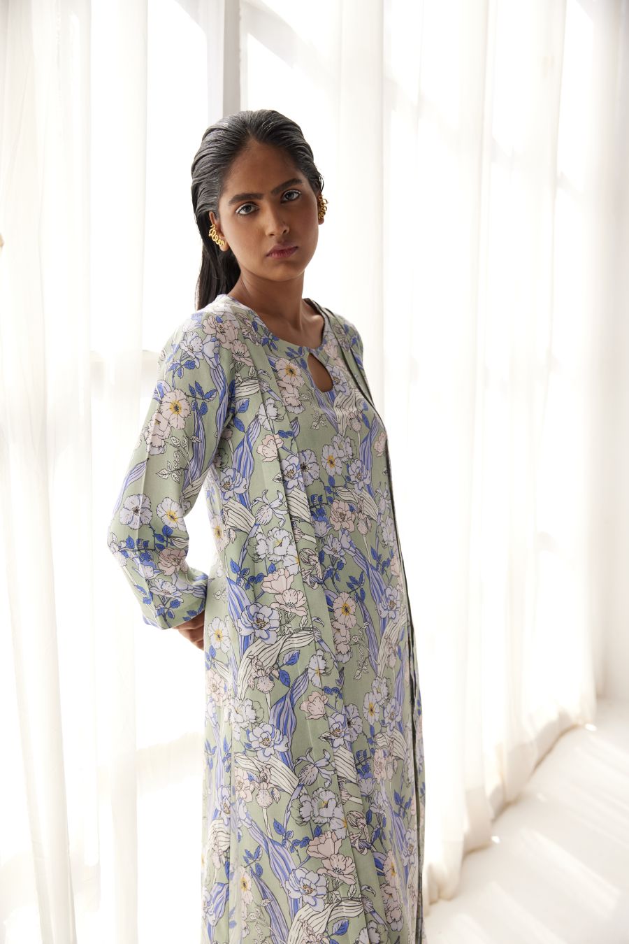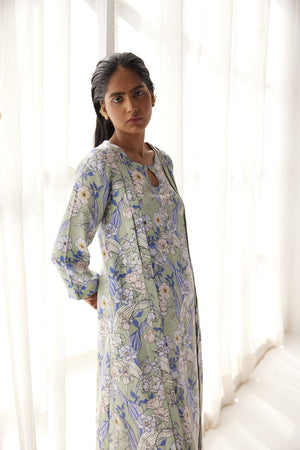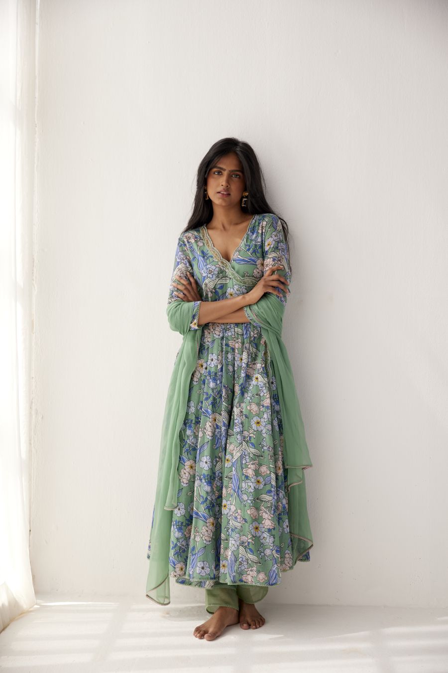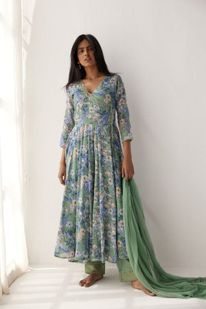 Granite Green cotton mul angarkha paired with granite green pants and chiffon dupatta