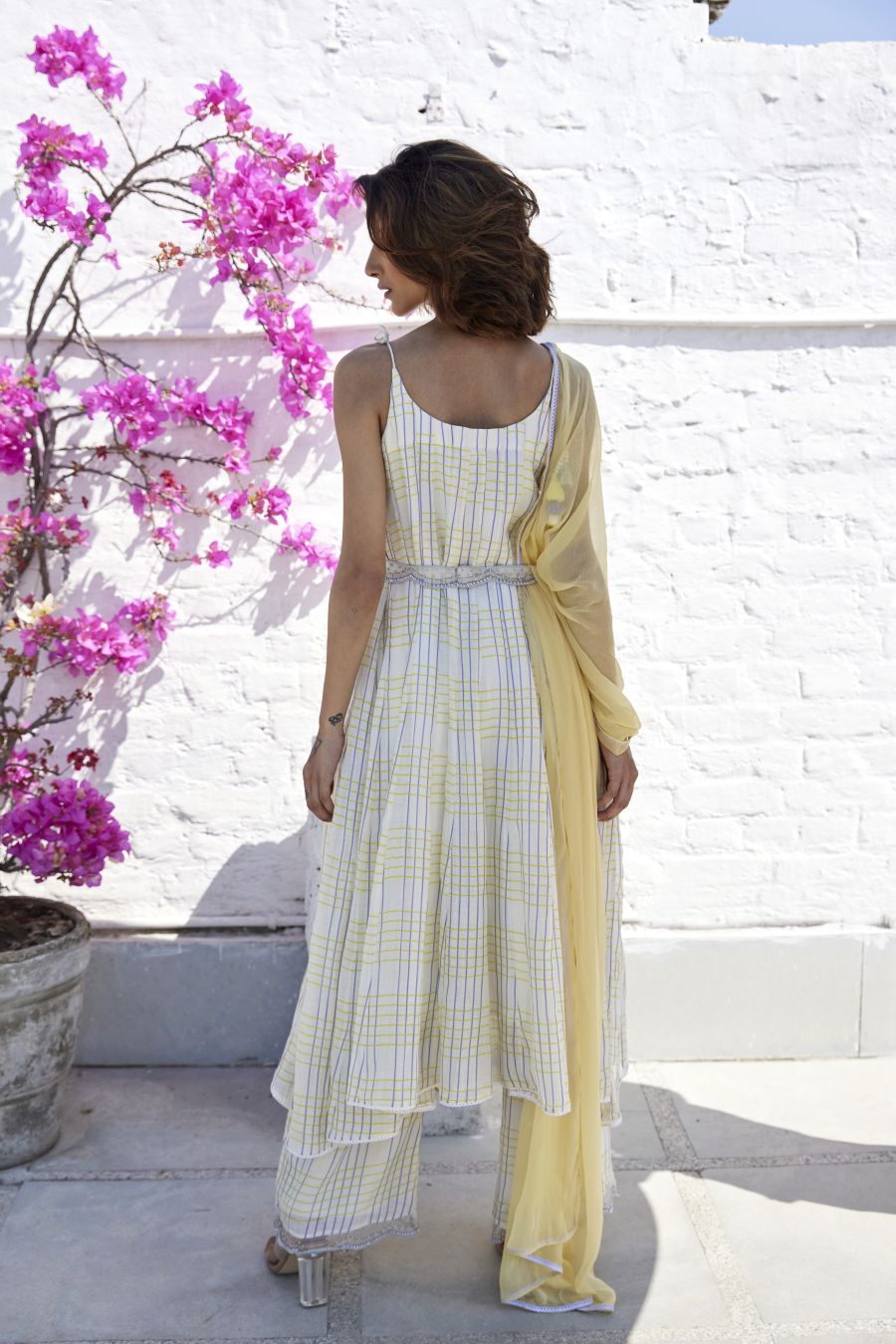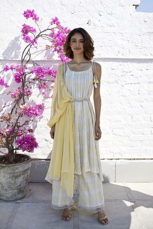 Yellow & Blue Chequered Spaghetti Kurta Set