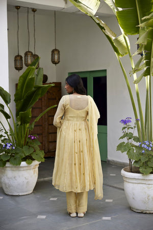Lemon Yellow Kota & Chanderi Anarkali Set