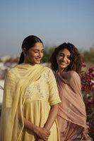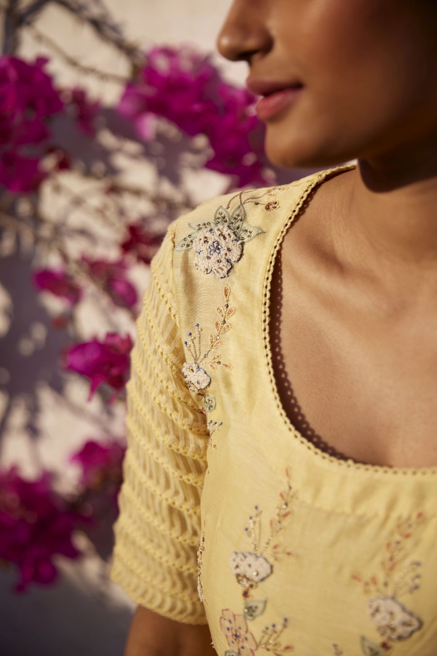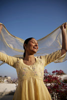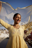 Lemon Yellow hand embroidered chanderi and organza silk anarkali paired with cotton silk pants and chiffon dupatta detailed with scallops and lace.