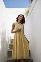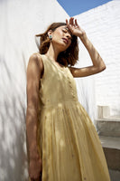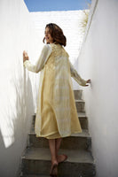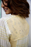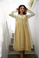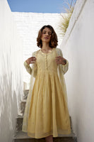 Lemon Yellow chequered chanderi overlay hand embroidered at the collar and back paired with chanderi sleeveless dress and cotton mul inner.