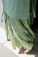 Sage green hand embroidered chanderi & kota cotton kurta paired with cotton mul inner, cotton silk chequered sharara and chiffon dupatta lined with lace.