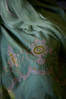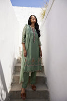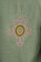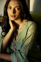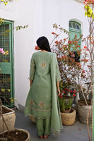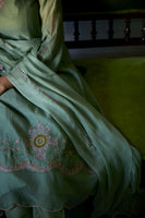 Sage Green chanderi hand embroidered Kurta paired with cotton silk pants and chiffon dupatta lined with lace.