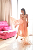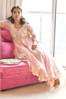 Featuring a Charm Pink Anarkali dress with intricate resham, tikki, gota, kasab, and mirror handwork on the jacket paired with a cotton silk inner lined with lampi, net churidar, and net dupatta hand-worked with gota, kasab, and tikki embroidery.