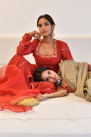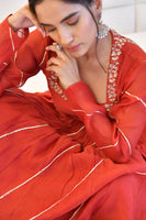 Featuring a Chilli Pepper Silk and Chanderi Anarkali detailed with resham embroidery on neckline and gota handwork on kali's paired with straight cotton silk pants and an organza gota dupatta.