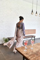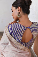 Metallic Pink Tissue Saree detailed with gota, kasab, and tikki border with Iris Blue printed blouse.