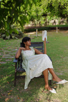 Ivory Jamdani dress with blue & yellow stripes mul overlay