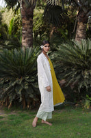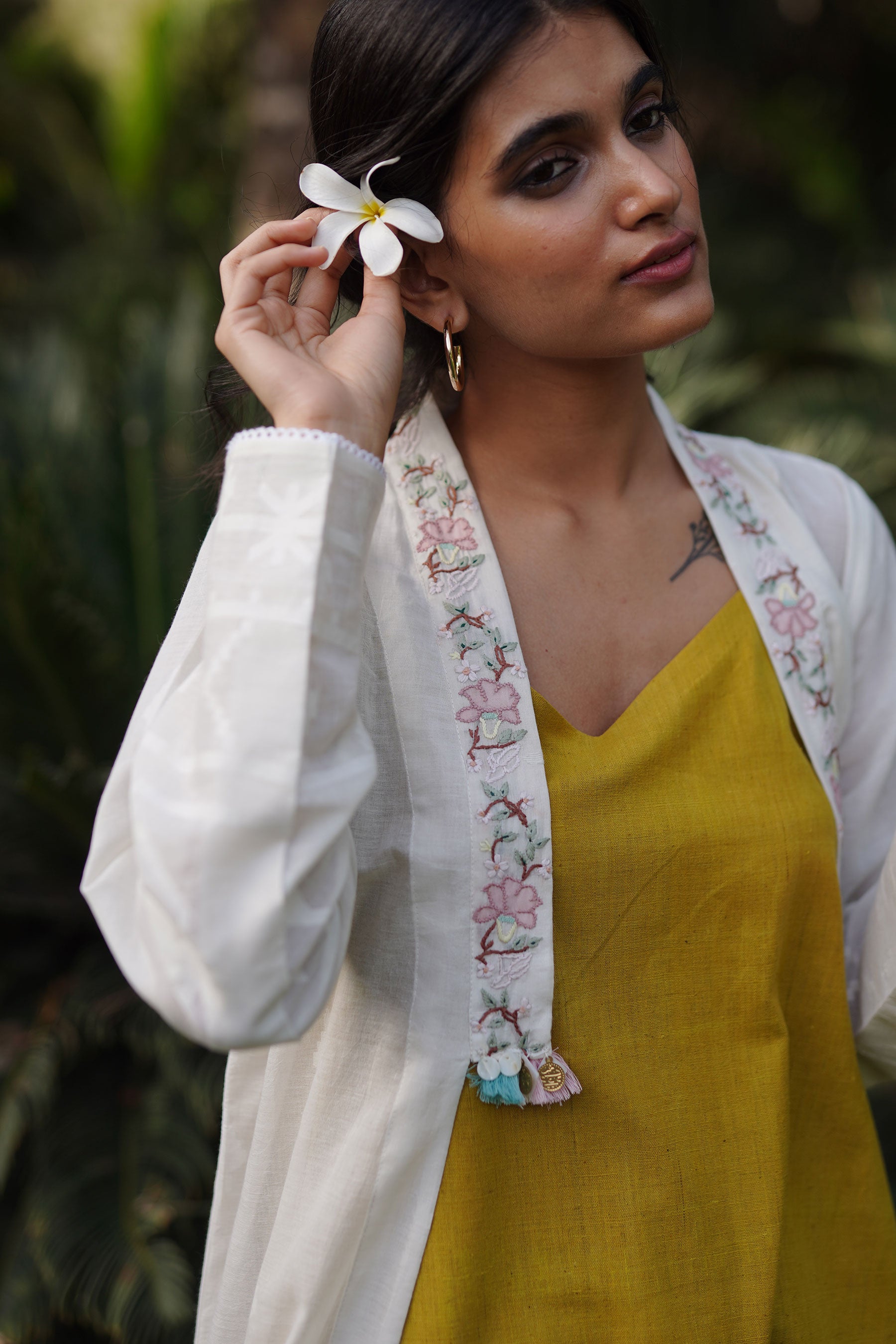Ochre yellow khadi kurta with patchwork paired with yellow blue stripe mul palazzos and ivory jamdani overlay with resham & shell embroidered collar.