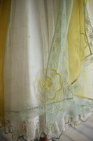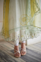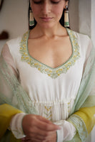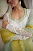 Ivory chiffon Anarkali with a Queen Anne neckline, sea green salli work on the neck, and floral cutwork on the ghera, paired with churidar and a two-toned cutwork dupatta.No.of pieces in a set: 3