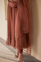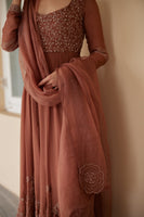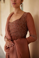 Nutmeg georgette anarkali with a queen anne neckline and embroidered yoke, churidar, and cutwork organza dupatta.