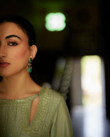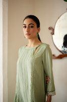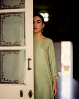 Hand-embroidered salli and pearl work on silk, sage green kurta with keyhole neckline and silk pants.
