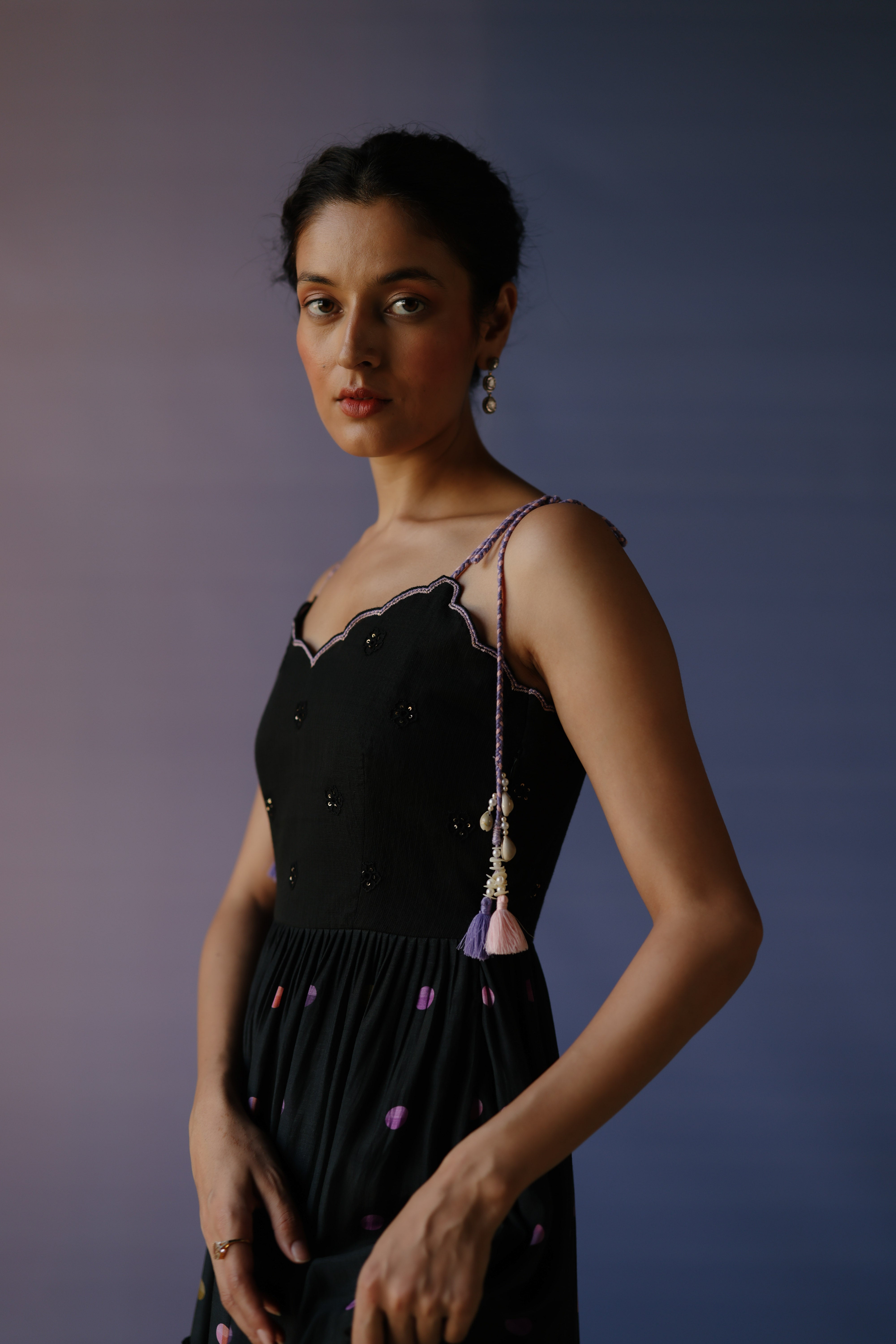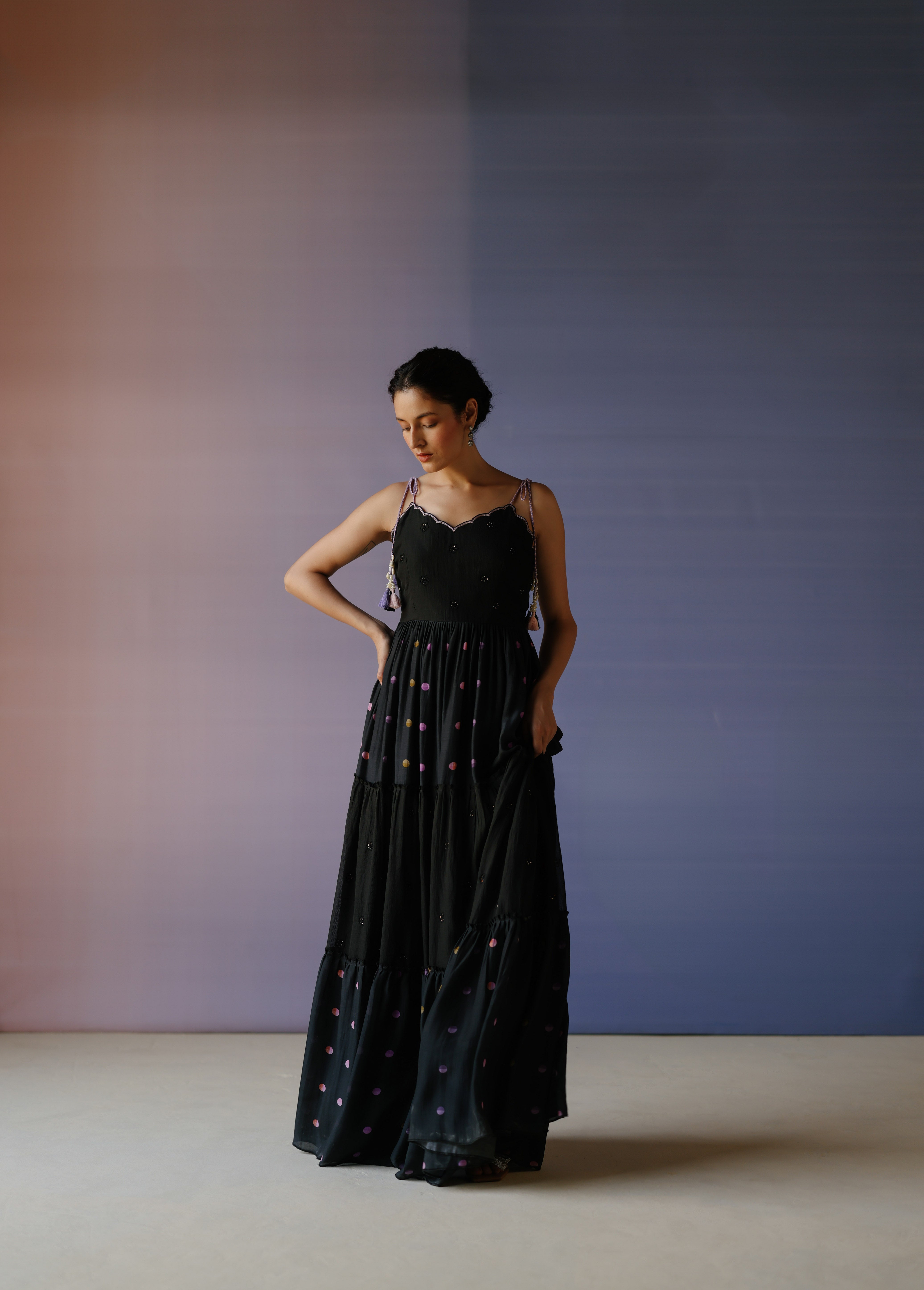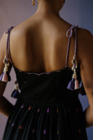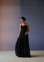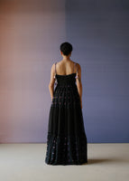 Black polka dot printed cotton silk spaghetti maxi dress intricately hand embroidered with tikki & resham. This is a one piece set that is hand embroidered.
