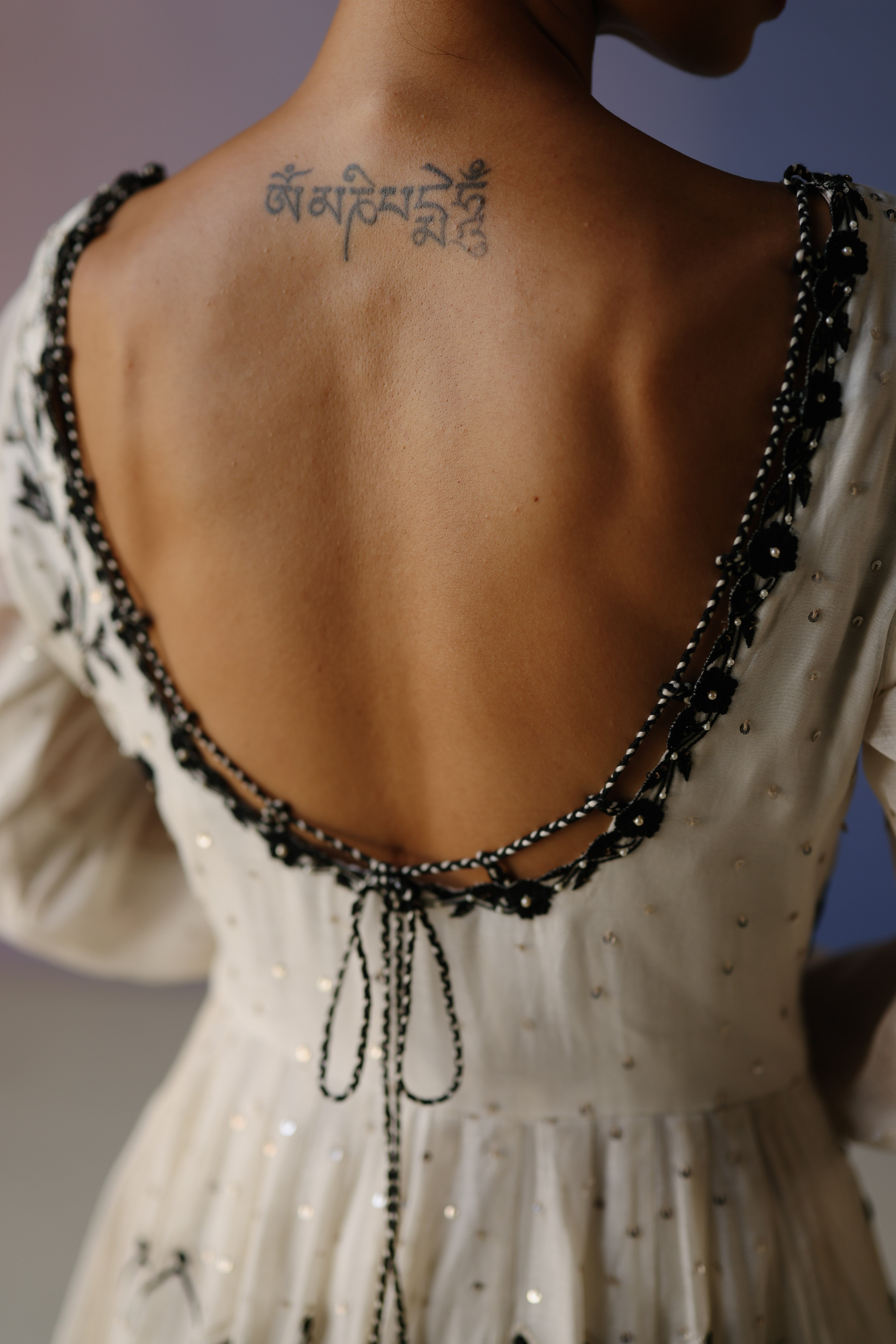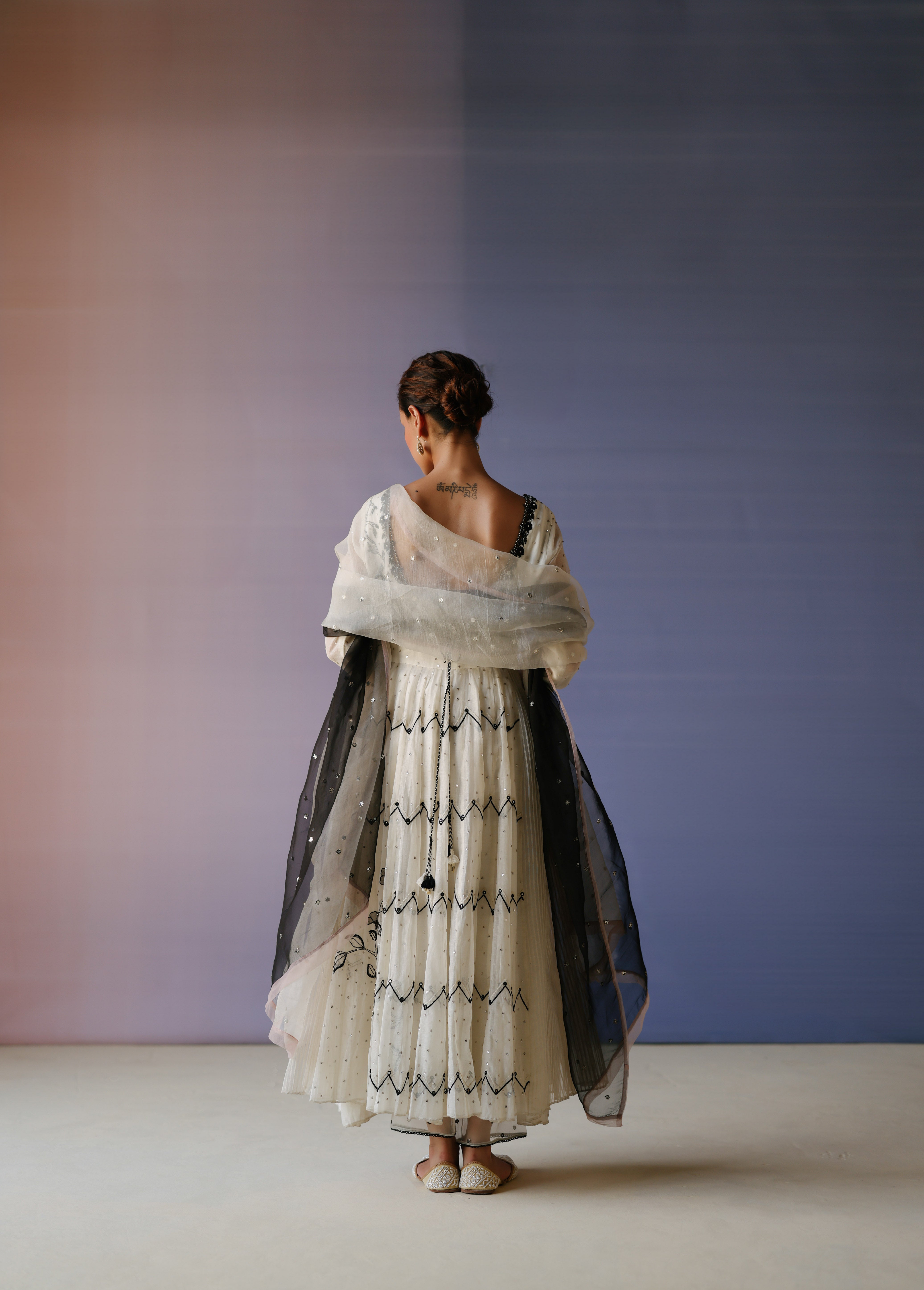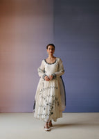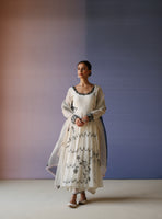 Ivory Chanderi & silk striped organza round neck anarkali intricately embroidered with resham, tikki, and mirror work and paired with cotton silk pants, and a sheer two-toned hand embroidered organza dupatta. This is a three-piece set that is completely hand embroidered.