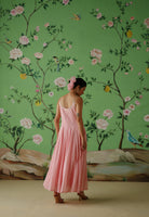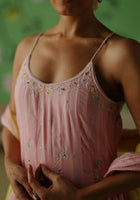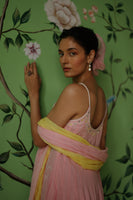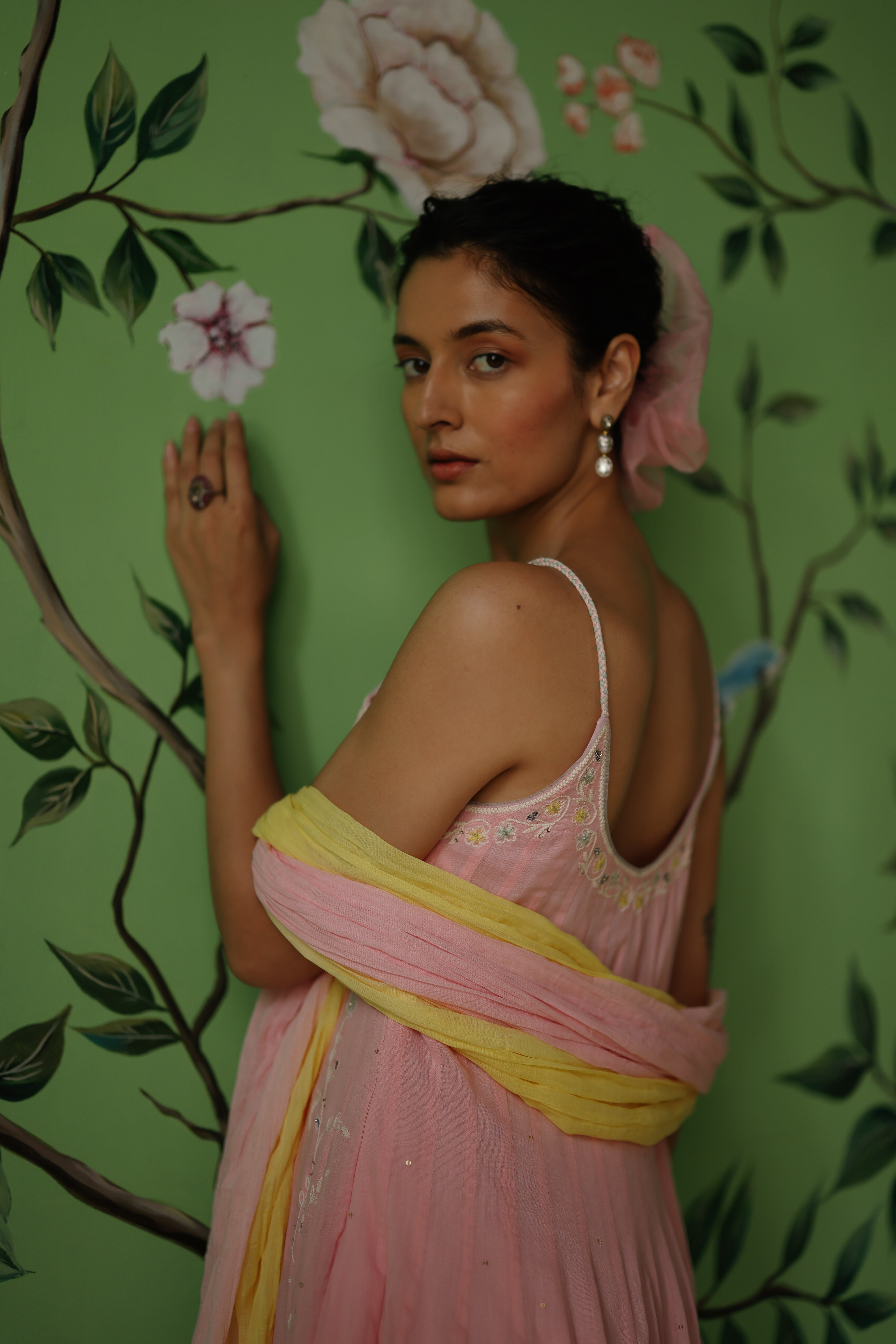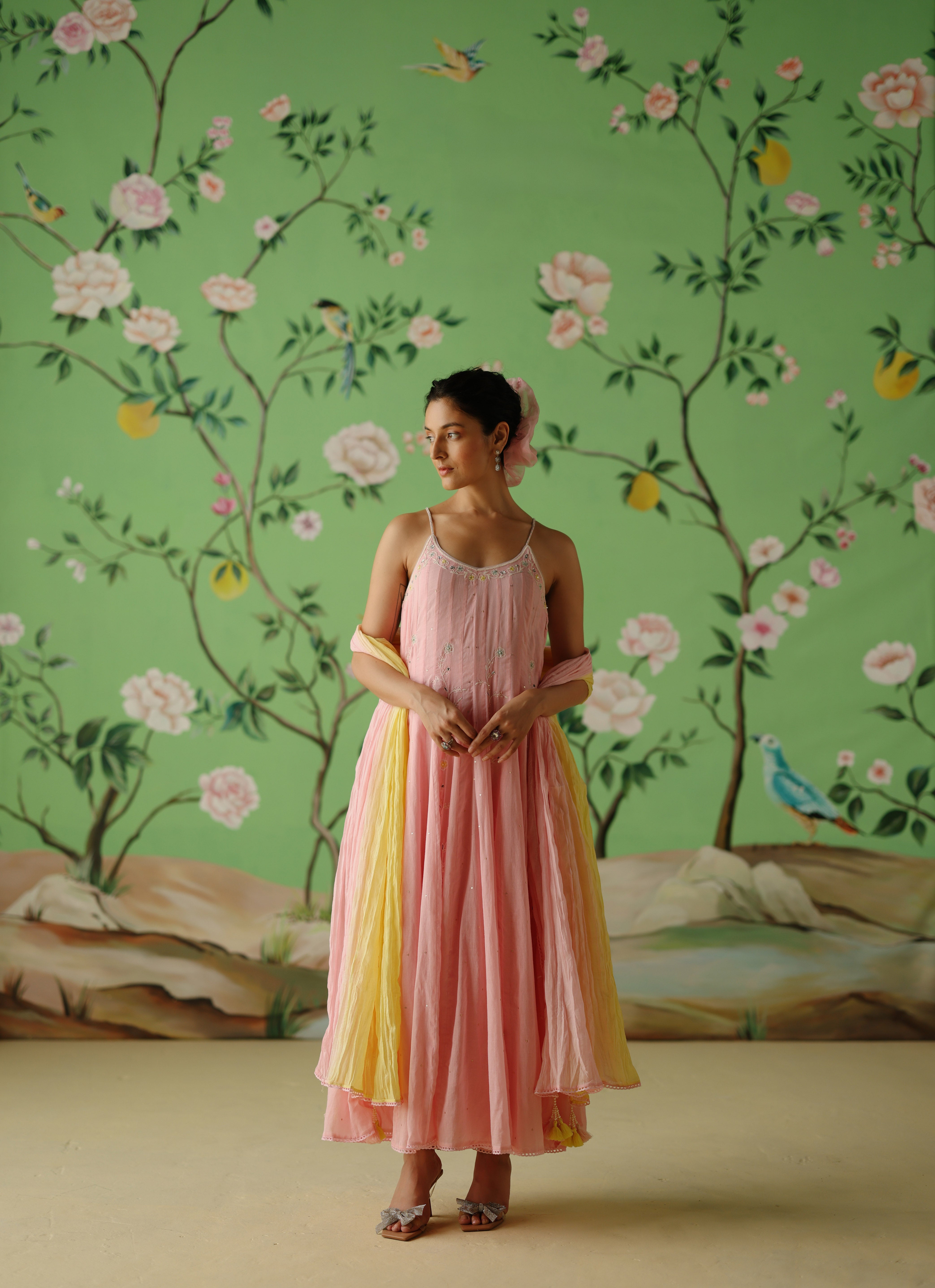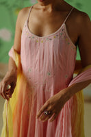 Pink mul spaghetti anarkali intricately hand embroidered with resham, tikki and pearl work and is paired with matching cotton silk pants and a two-toned yellow and pink mul dupatta. This is a three-piece set and is completely hand embroidered.