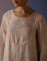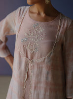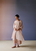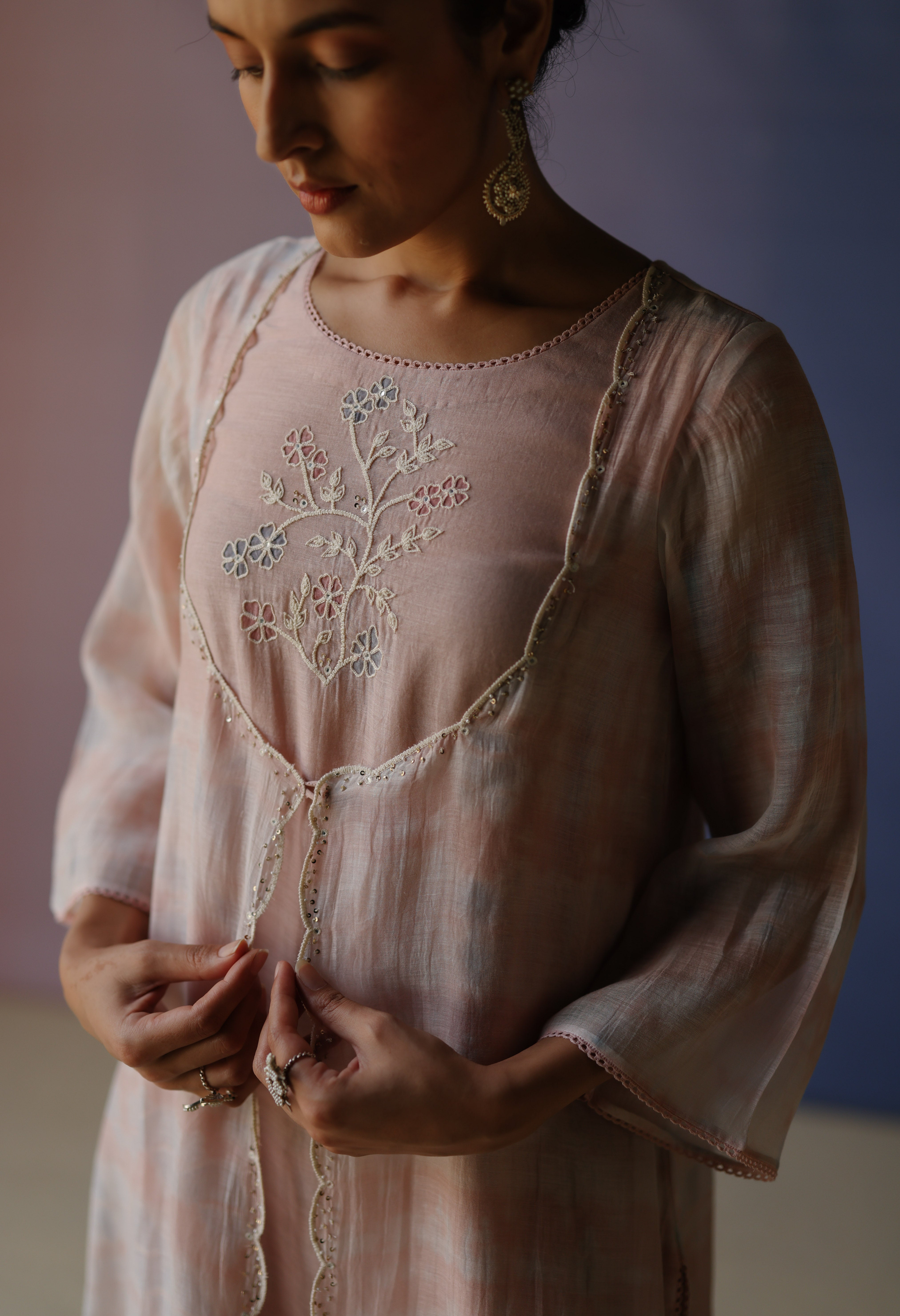 Pink tie & dye chanderi anarkali intricately embroidered and hand painted and paired with tri ombre cotton silk pants and a matching chiffon dupatta. This is a three-piece set and is completely hand embroidered.