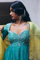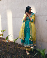Bottle Green Chanderi Anarkali features intricate hand embroidery with gota, chalak, kasab and beads, paired with yellow hand embroidered chanderi pants and a pure organza hand embroidered yellow dupatta.