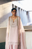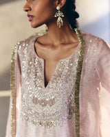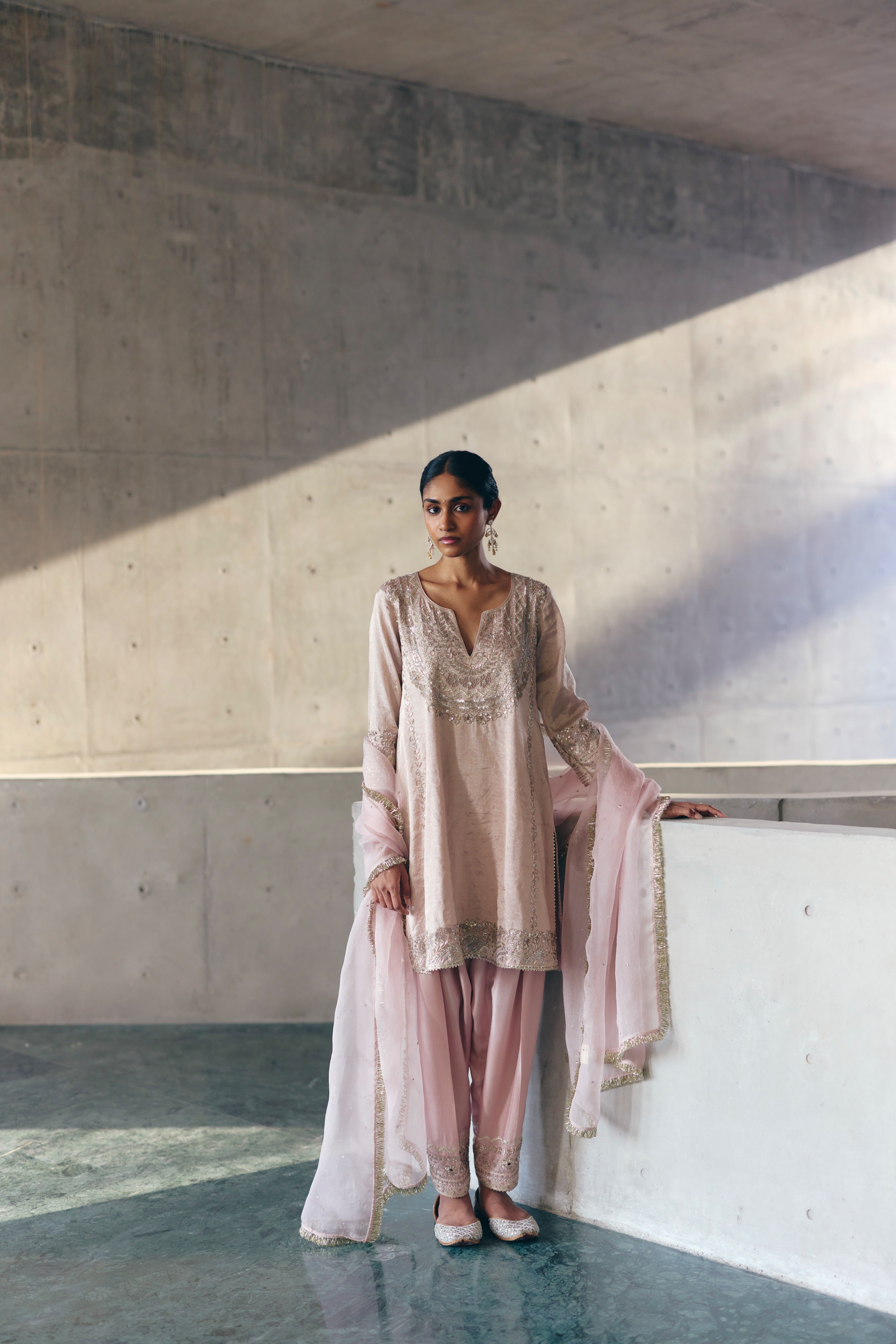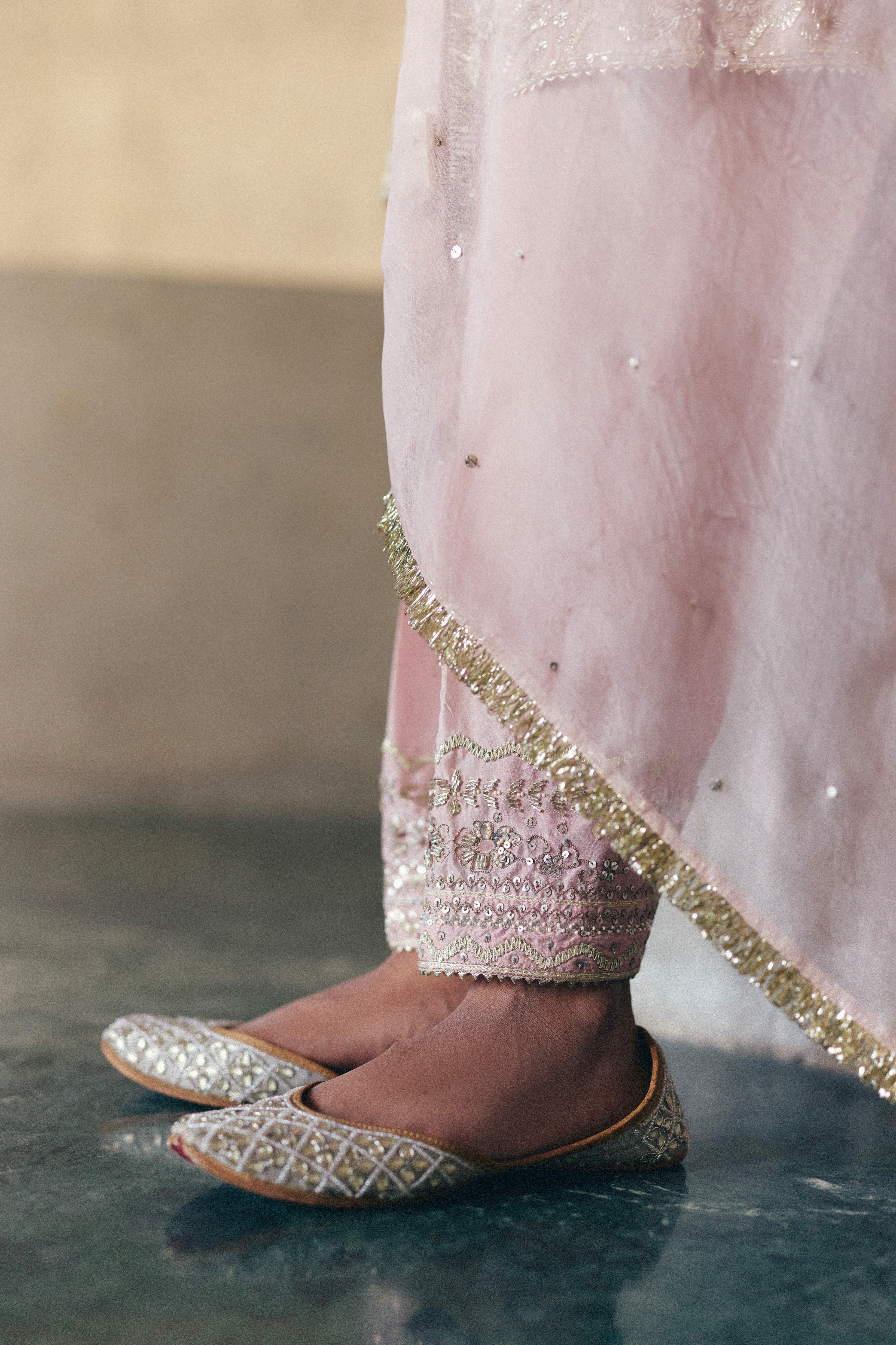 Dusty Rose Pink Tissue Kurta features intricate hand embroidery with gota, salli, beads, kasab, tikki and cutwork, paired with dusty rose pink hand-embroidered pure silk salwar and a dusty rose pink pure organza dupatta.