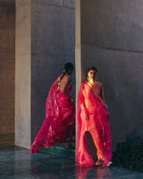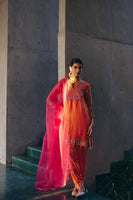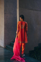 Orange Stripe Tissue Kurta features intricate hand embroidery with gota, chalak, mukaish, patchwork, kasab and tikki, paired with orange hand-embroidered pure silk salwar and rani pink pure organza dupatta.