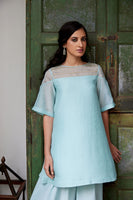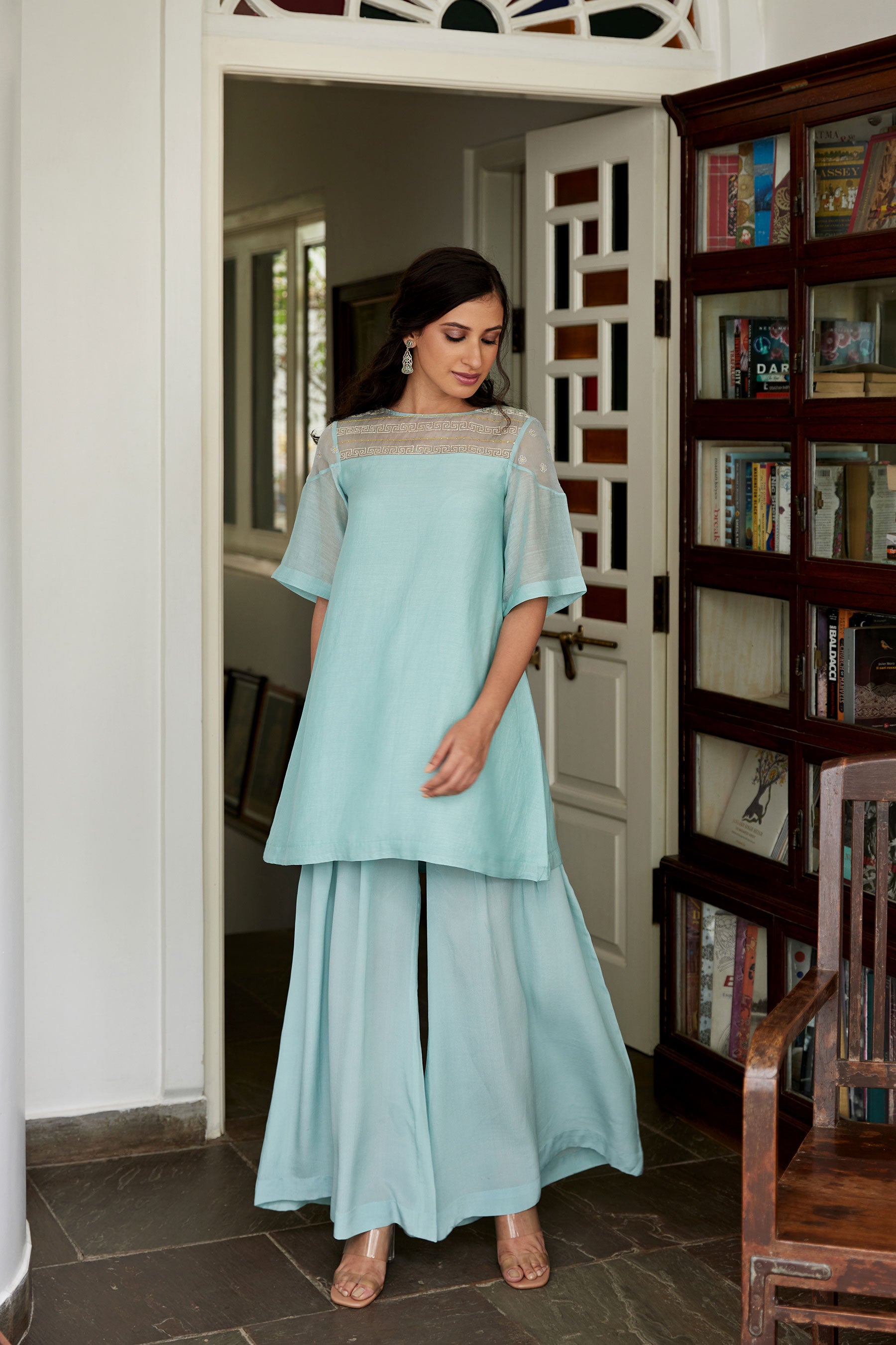 Featuring a powder blue boat neck kurta in chanderi base and gota dori work. It is paired with matching loose chanderi palazzos.