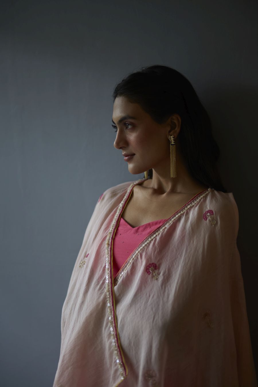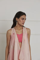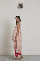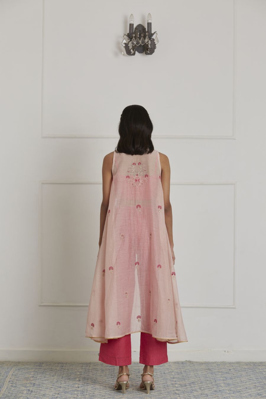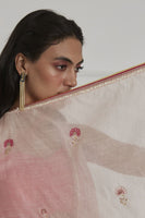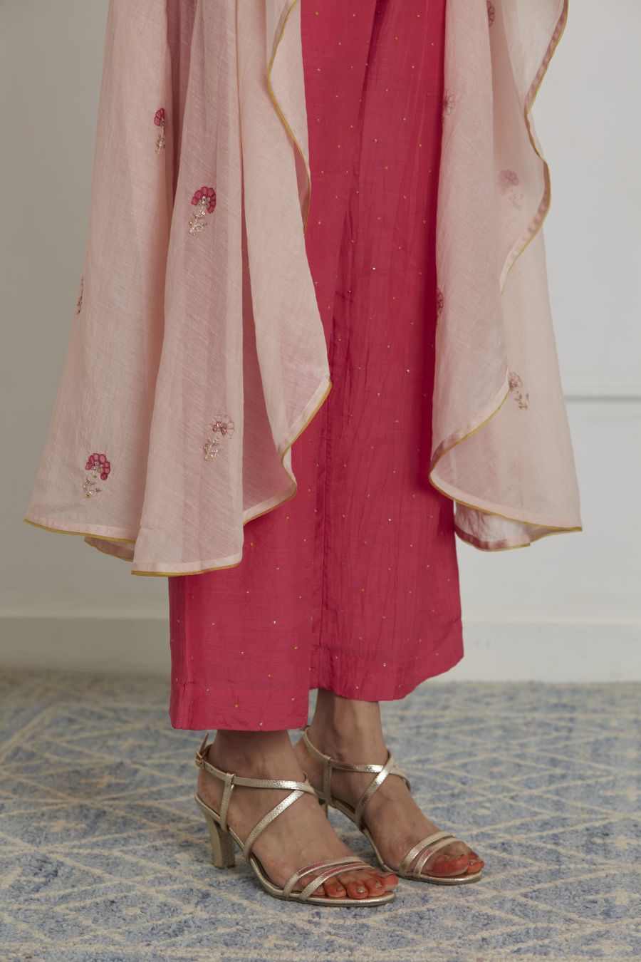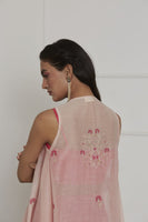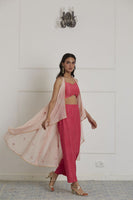 Featuring a fuschia pink bustier in cotton silk base paired with matching cotton silk pants. It is paired with rose pink chanderi overlay intricately hand embroidered in flower motifs with resham, tikki and sulli work.