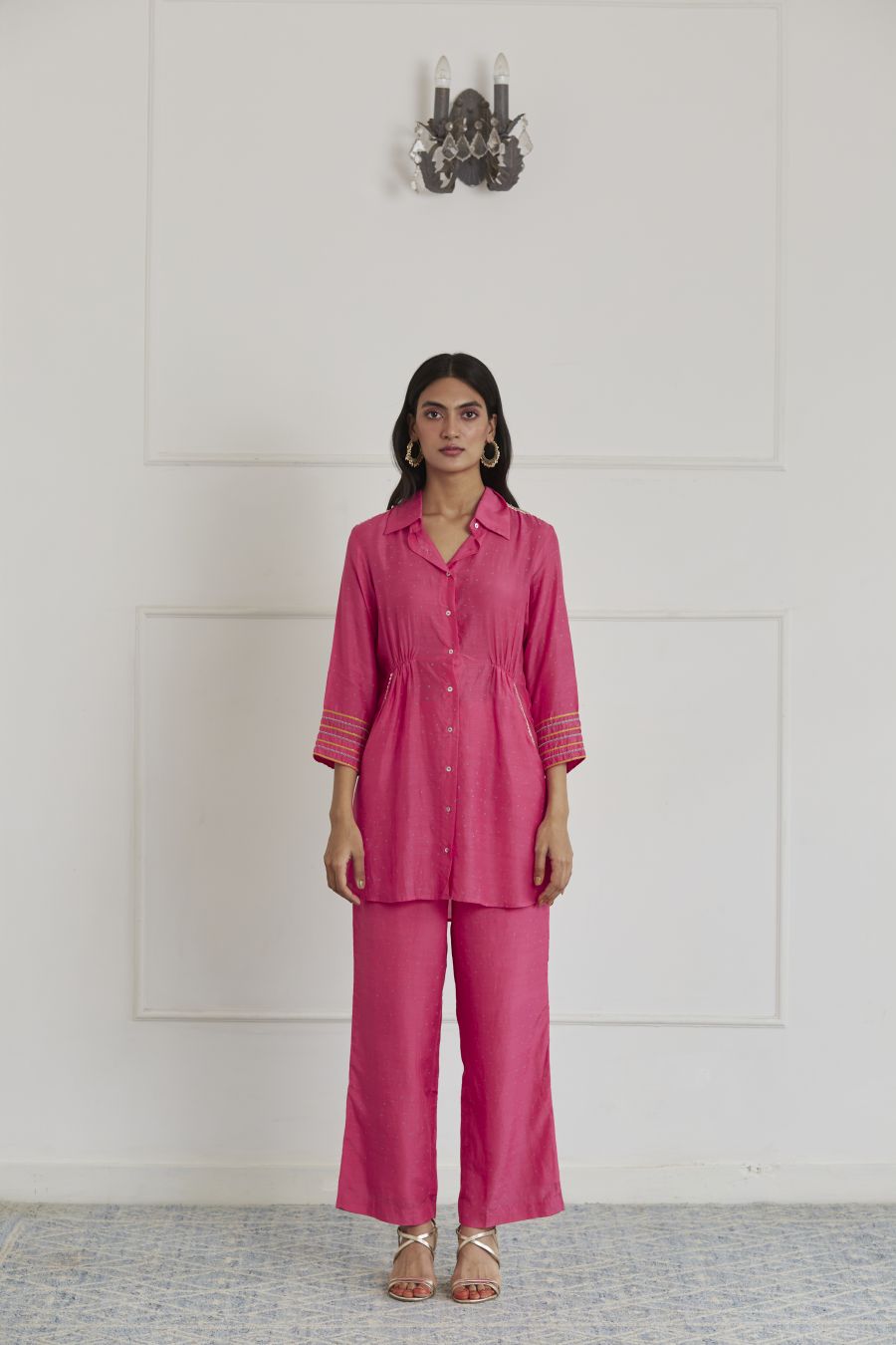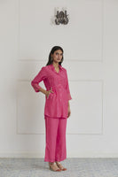 Featuring a fuschia pink hand blocked co-ord set in cotton silk base.