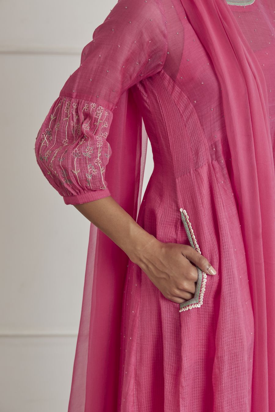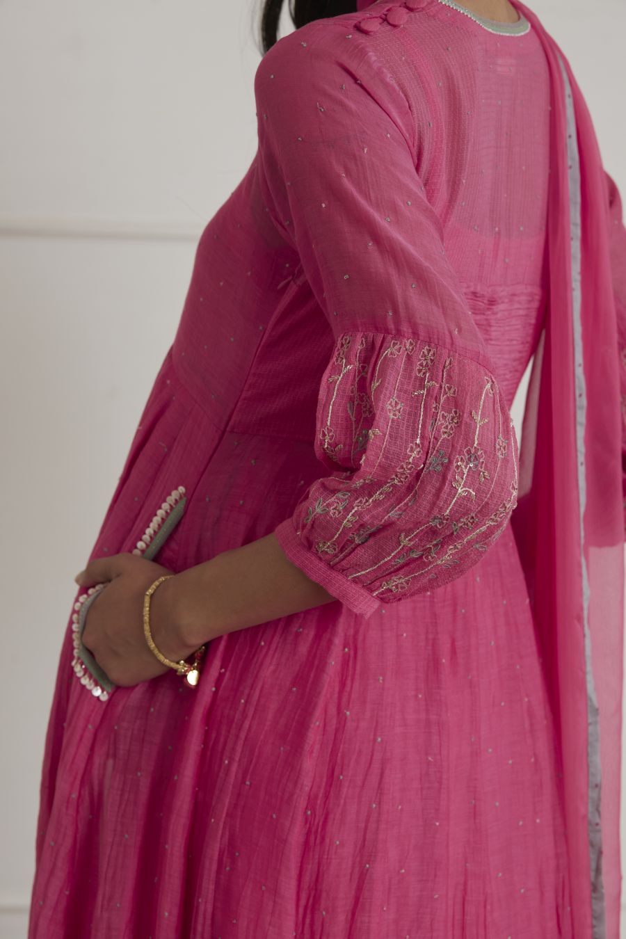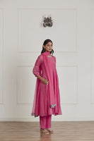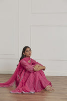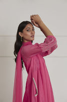 Featuring a fuschia pink anarkali in chanderi and kota base with hand embroidered puff sleeves. It is paired with matching cotton silk pants, cotton mul inner and chiffon dupatta.