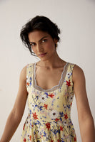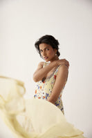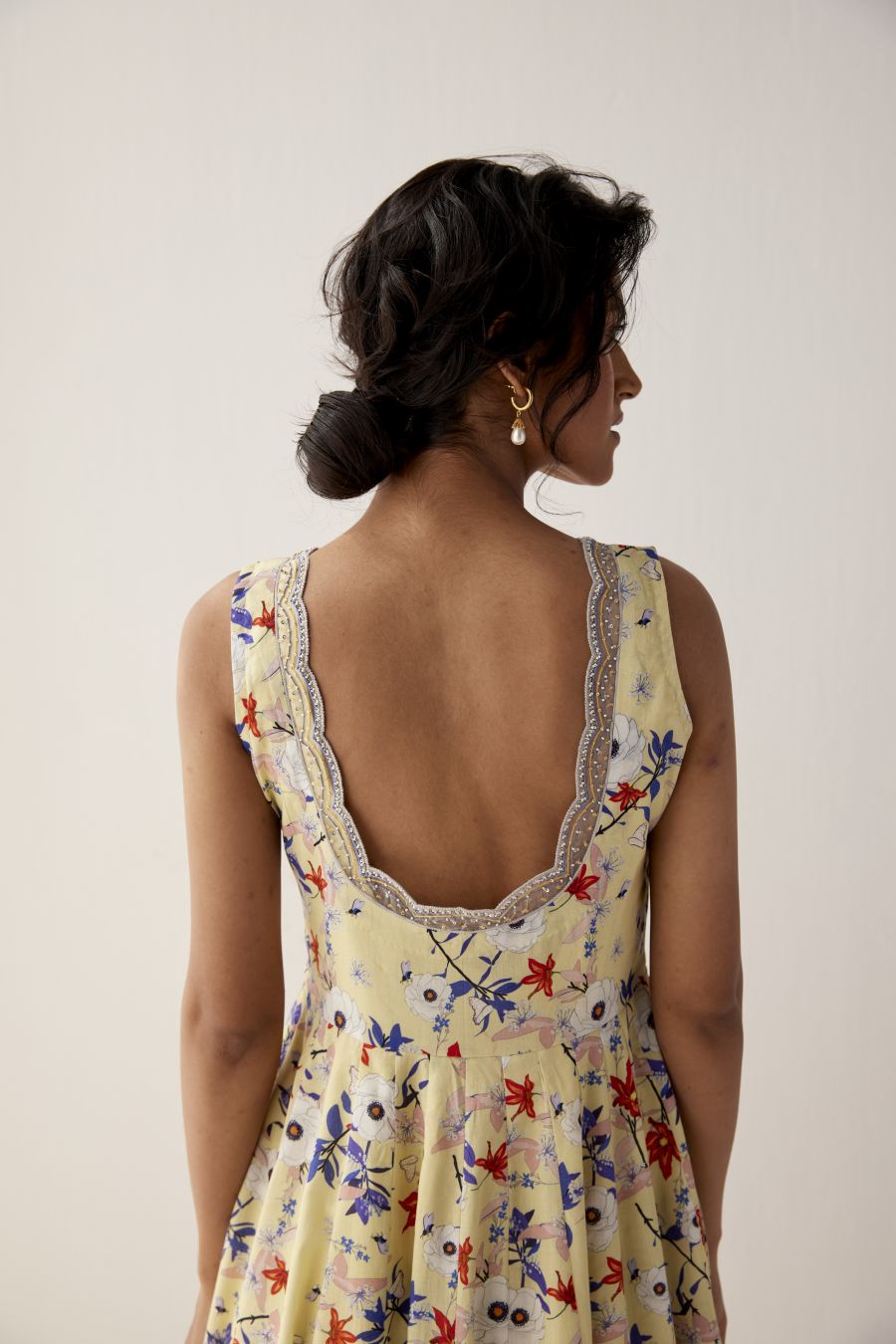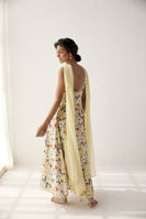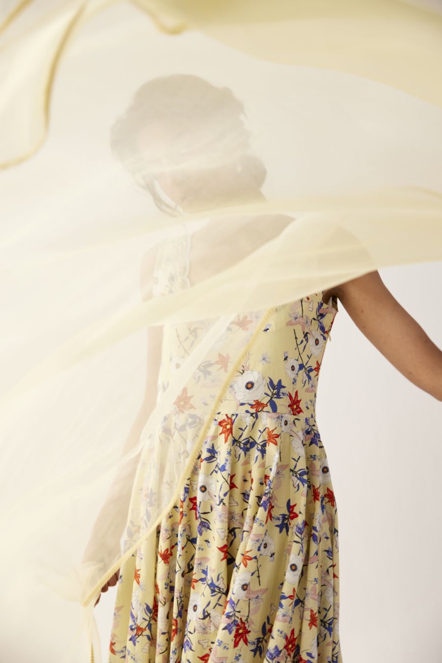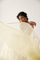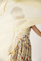 Lemon Yellow anarkali made in cotton mul with digitally printed floral jal over a lemon yellow base hand embroidered with pearls & tikki on the front and back neckline. Paired with lemon yellow digitally printed pants detailed with hand embroidered organza scallops and chiffon dupatta with lace.