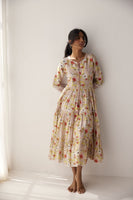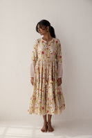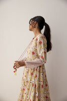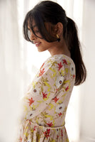 Lotus Pink dress made in chanderi with digitally printed floral jal all over and kota sleeves embroidered with thread and pearl hand embroidery. Paired with a cotton mul inner.