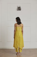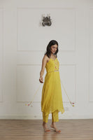 Featuring a mustard yellow handkerchief cut kurta in chanderi and kota base hand embroidered at the yoke. It is paired with matching cotton silk pants and rose pink chiffon dupatta detailed with contrasting hand block printed border.