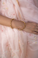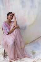 Featuring a Pink Kota Saree detailed with intricate hand embroidered patchwork, resham, and tikki work. It is paired with viscose silk peach and a grey tie & dye blouse.